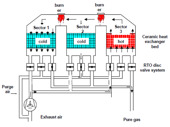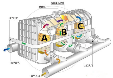 廢氣成為凈化的高溫氣體后離開燃燒室,進入蓄熱室C(上兩個循環(huán)陶瓷介質(zhì)已被冷卻吹掃),釋放熱量,溫度降低后排放,而蓄熱室C的陶瓷吸熱,貯存大量的熱量(用于下個循環(huán)加熱使用)。蓄熱室B在這個循環(huán)中執(zhí)行吹掃功能。