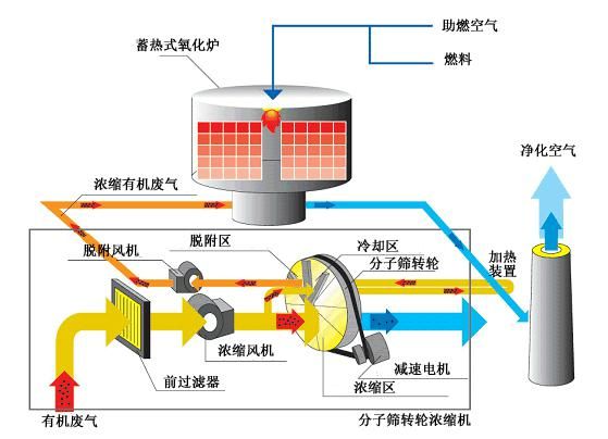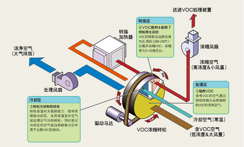 低濃度、高風量的有機廢氣流過濃縮轉輪吸附區(qū)時,其中的揮發(fā)性有機物會被吸附下來。經(jīng)過吸附凈化后的氣體(風量約占總量的90%)排放到空氣中去。一小部分氣體(風量約占總量的10%)被加熱到脫附溫度。濃縮轉輪持續(xù)旋轉到脫附區(qū)域,在此有機物從吸附劑上脫離到加熱的少量氣流中,從而轉輪得到再生。而高濃度、低風量的濃縮VOCs氣體最終被送入焚燒爐TO/RTO處理。再生后的沸石轉輪進入冷卻區(qū),被冷卻到常溫后,再進入吸附區(qū)。