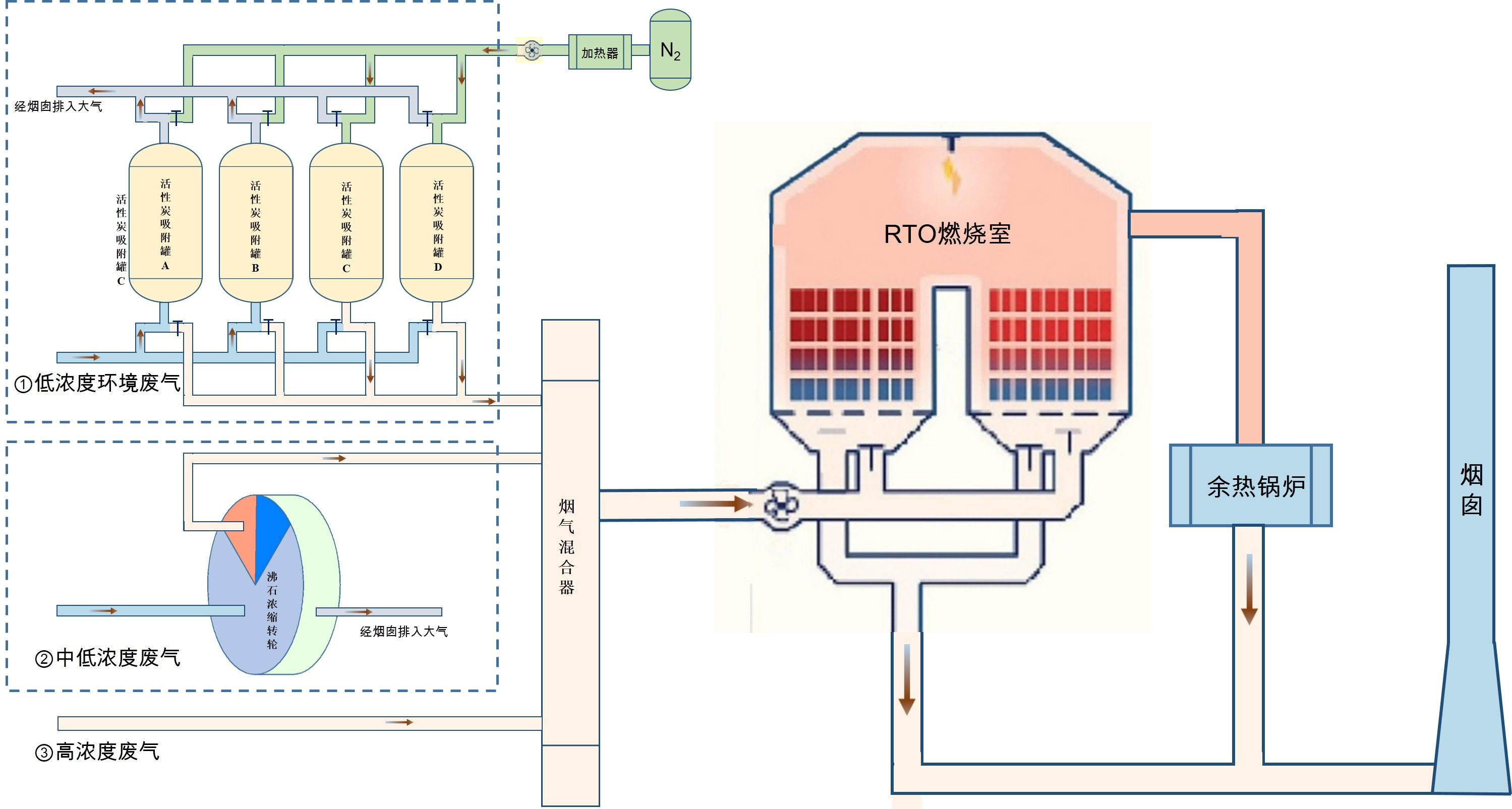 通常涂料或涂裝工廠的廠區(qū)存在多個VOCs的排放點、VOCs的濃度分布不均等特點,單獨的處理工藝很難解決全廠的VOCs排放問題??刹捎脛?chuàng)新性地開發(fā)了“活性炭氮氣脫附+沸石濃縮+RTO”組合工藝,并在實際工程中得到了應(yīng)用,該工藝能夠全方位的治理涂料或涂裝廠區(qū)的VOCs廢氣。該工藝的示意圖如下圖所示: